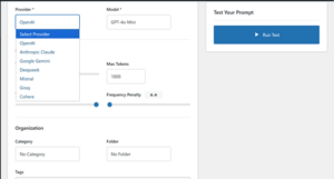 | Provider | Select the AI provider to use for this prompt (e.g., OpenAI, Google Gemini). |